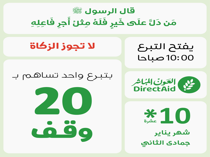 Direct Aid kicks off the New Year (2024) with a special campaign to support endowment projects as part of the monthly 10x10 campaign. The new campaign begins on the first day of January under the name "20x20," signifying a distinct start to the monthly Direct Aid campaigns. The campaign includes [...]